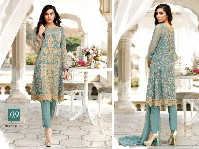 Chantelle Chiffon by Baroque Vol 2 offers 3 piece bamber chiffon suits with heavy embroidery and raw silk trousers.