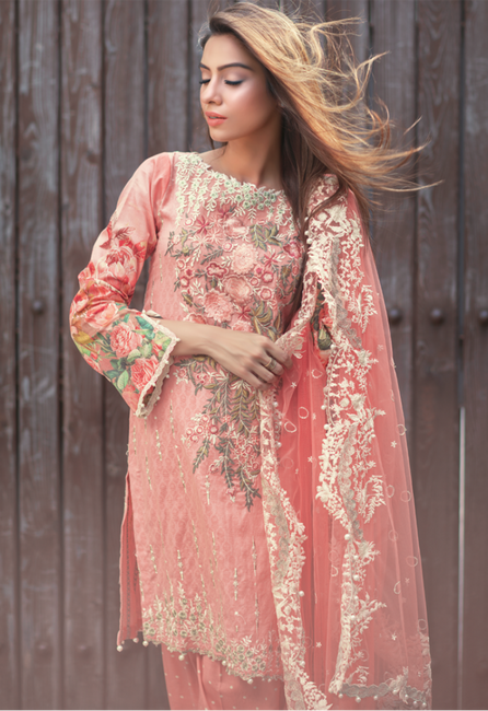 Embroidered jacquard shirt 3meter, embroidered jacquard trouser 2.5 meter, Embroidered net dopatta 2.5 meter