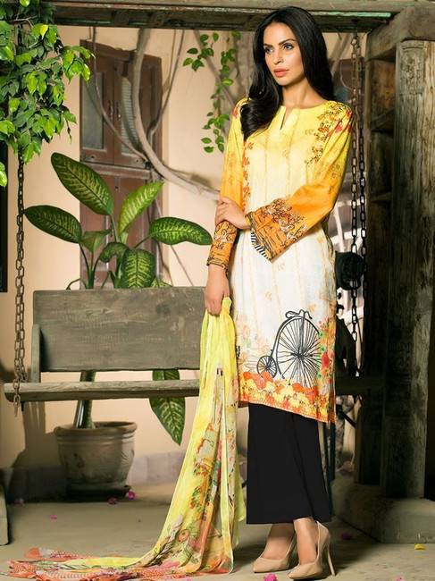 3 meter digital printed lawn shirt, 2.5 meter digital printed crinkle dupatta, 2.5 meter dyed trouser.